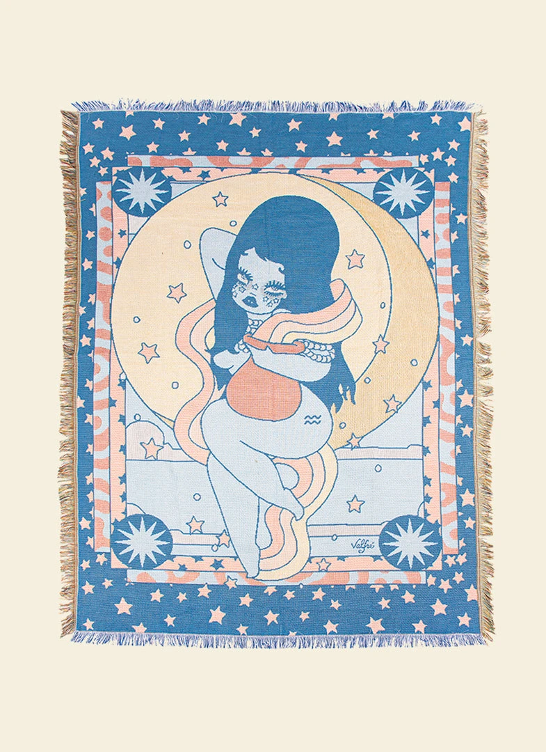 This large woven blanket features original Valfré Aquarius artwork. Drape it across your bed/couch, hang it in your living space, or bring it on a picnic.