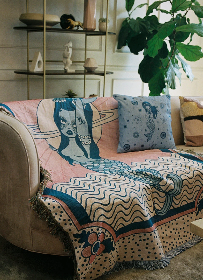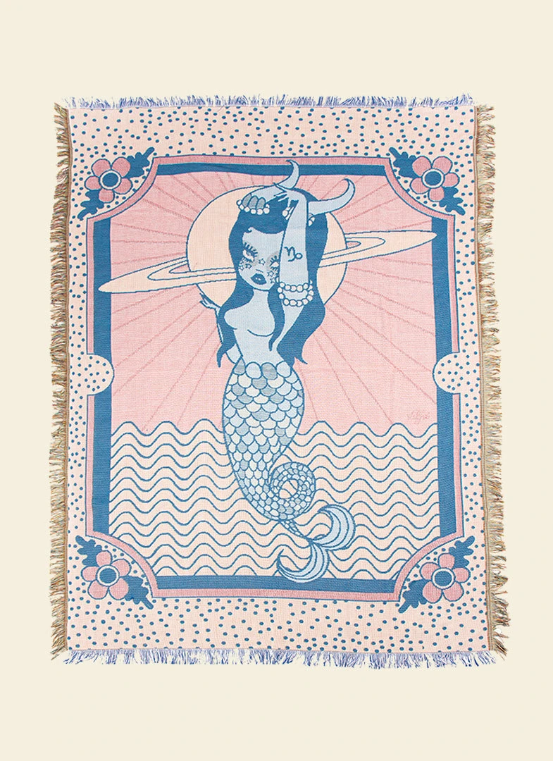 This large woven blanket features original Valfré Capricorn artwork. Drape it across your bed/couch, hang it in your living space, or bring it on a picnic.