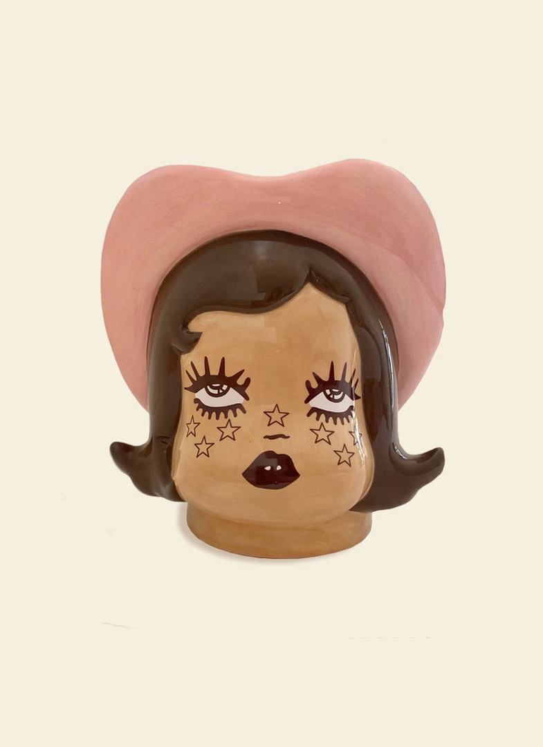This ceramic planter features the head shape the Valfré character, Maria. Put your favorite plant, flowers, art supplies, or make-up brushes inside. Each planter is unique, so colors and textures will slightly differ from piece to piece.