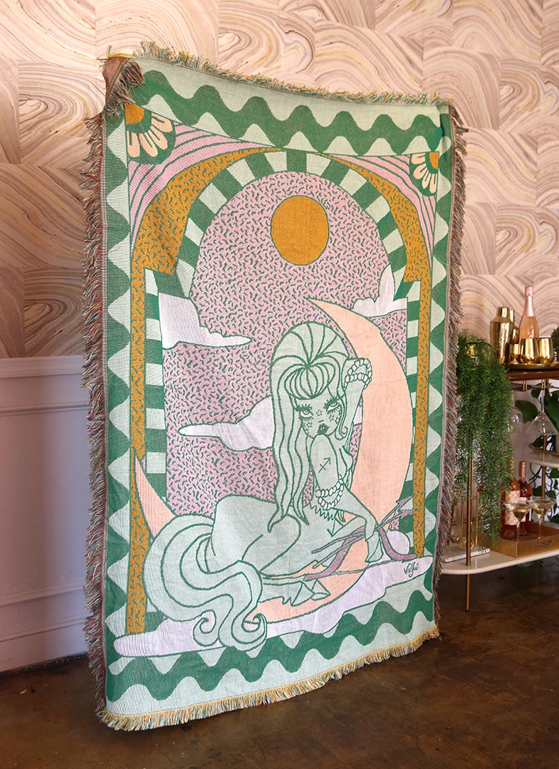 This large woven blanket features original Valfré Sagittarius artwork. Drape it across your bed/couch, hang it in your living space, or bring it it on a picnic.