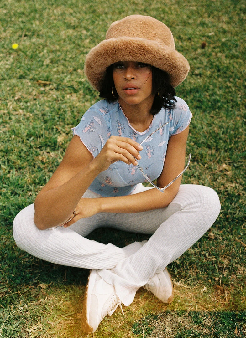 This blue mesh top features an all over Cherub pattern.