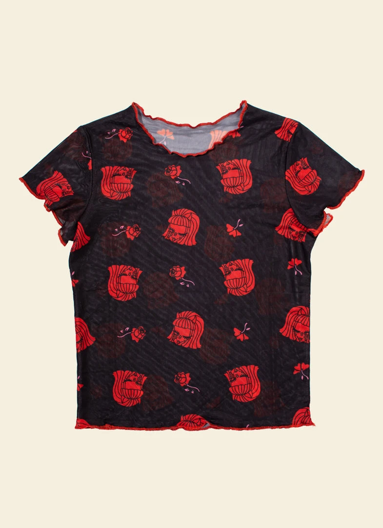 This black mesh top features an all over Lucy pattern.