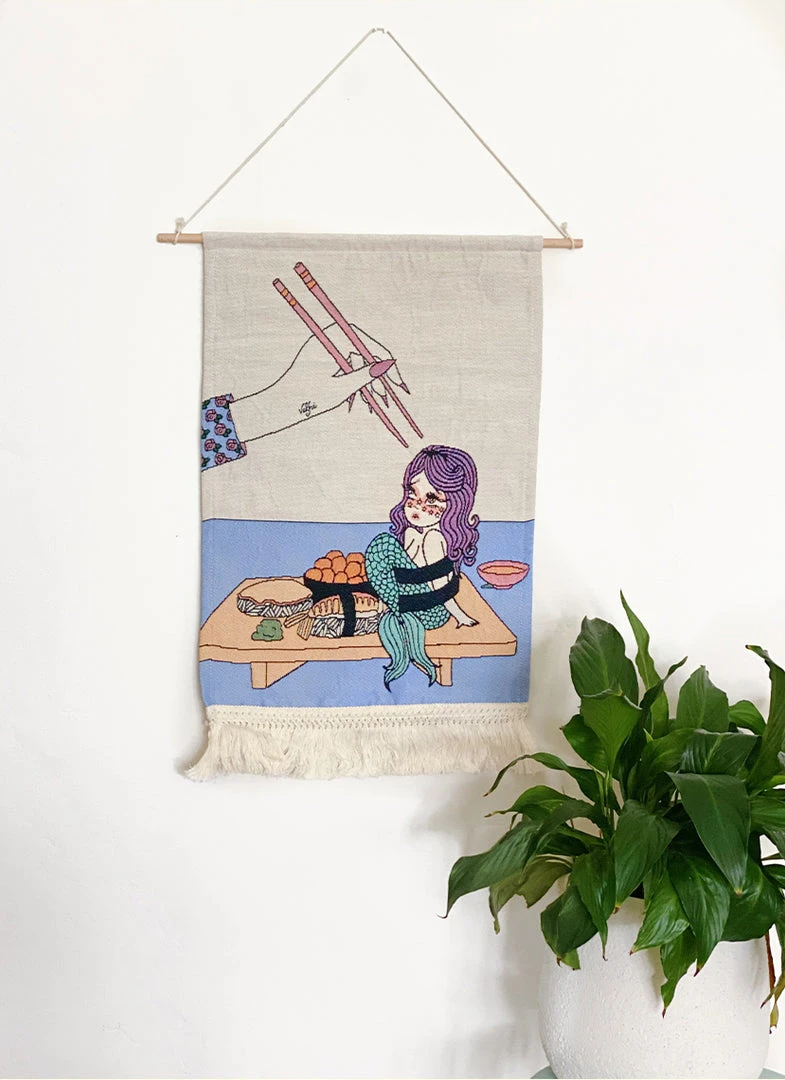 This woven tapestry features original Valfré artwork, a wooden rod to easily hang, and fringe at the bottom.