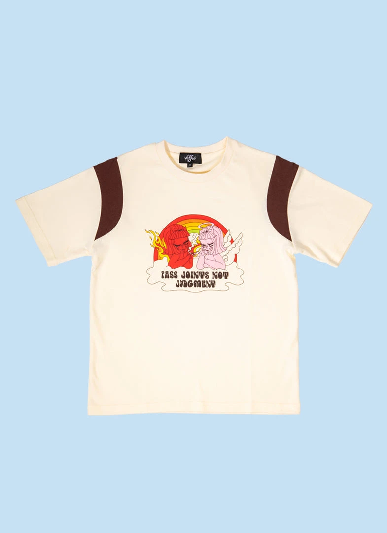 This super soft white tee features original Valfré artwork and color block details .