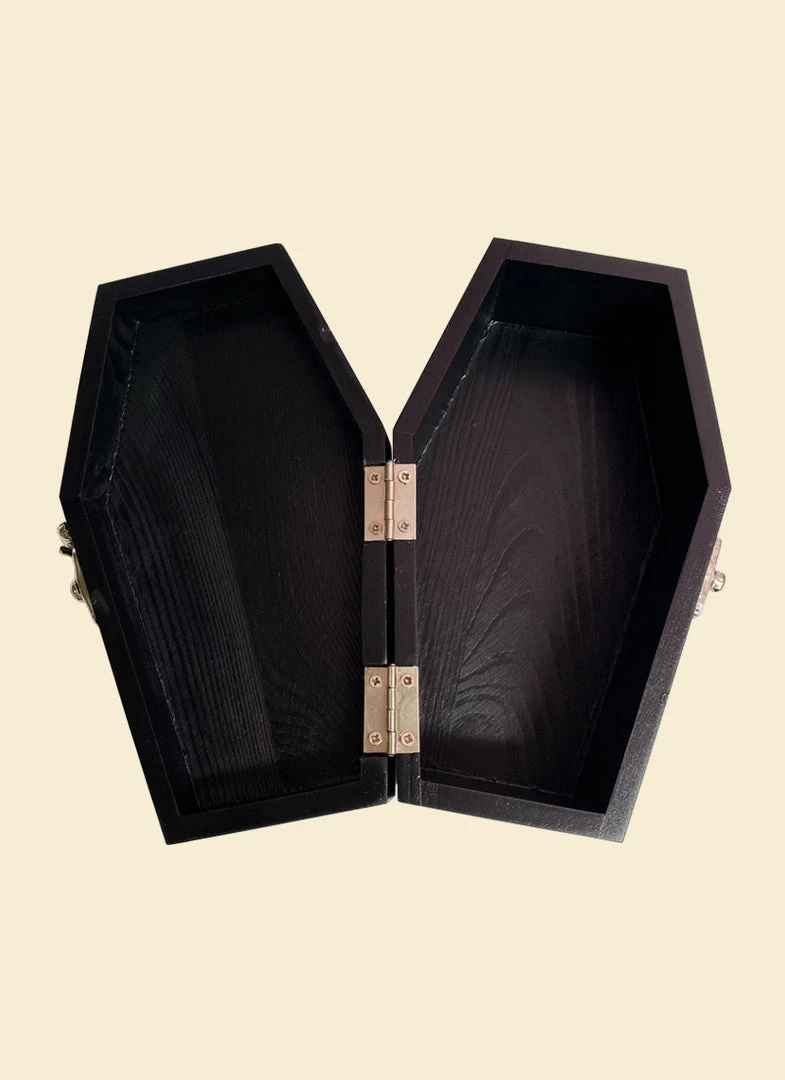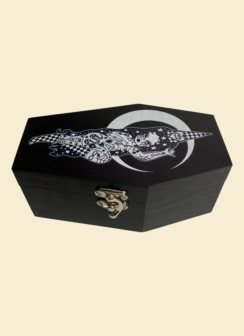 This wooden black stash box features original Valfré Wizard artwork, a latch closure, and compartments inside.