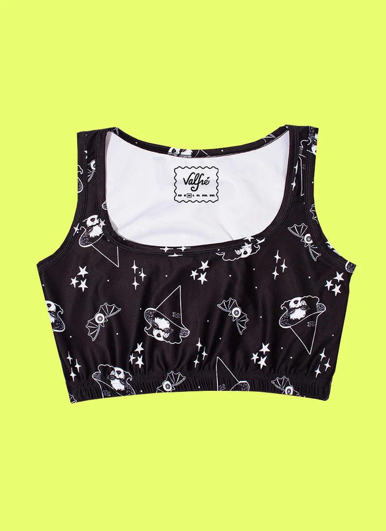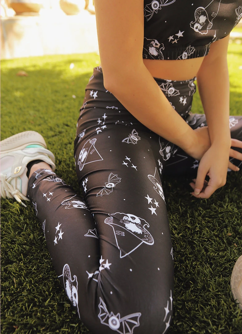 This two piece athletic set includes a matching cropped sports bra and legging pants. Each feature an original Valfré halloween artwork pattern. The pants have a flattering high waisted fit, and the sports bra features a stretchy elastic band on the bottom.